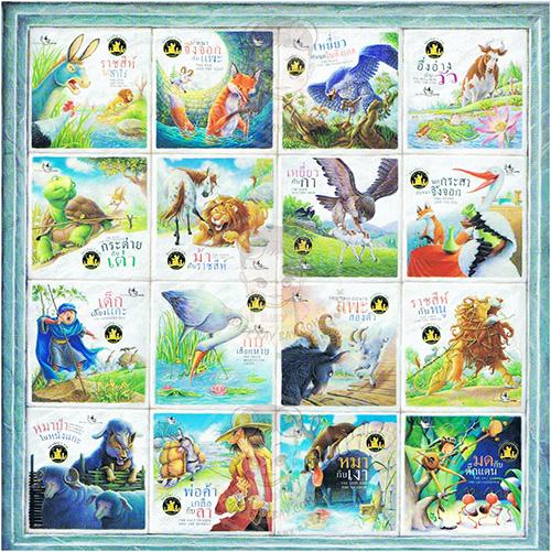 ราชสีห์ ไก่และลาโง่ --The Lion, The Cock and The Ass หมาจิ้งจอกกับแพะ --The Fox and The Goat เหยี่ยวกับนกไนติงเกล --The Hawk and The Nightinngle อึ่งอ่างกับวัว --The Bullfrog and The Cow กระต่ายกับเต่า --The Hare and The Tortoise ม้ากับราชสีห์ --The Horse and The Lion เหยี่ยวกับกา --The Hawkand The Crow นกกระสากับหมาจิ้งจอก --The Stork and The Fox เด็กเลี้ยงแกะ --The Shepherd Boy กบเลือกนาย --The Frogs Begging for a King แพะสองตัว --The Two Goats ราชสีห์กับหนู --The Lion and The Mouse หมาป่าในหนังแกะ --The Wolf in Sheep's Clothing พ่อค้าเกลือกับลา --The Salt Trader and The Donkey หมากับเงา --The Dog and The Shadow มดกับตั๊กแตน --The Ants and The Grasshopper