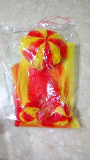 ทำด้วยผ้าแพรสีแดงสลับสีเหลือง มีดอกใหญ่ 1 ดอก และชายยาวข้างละ 2 เมตร