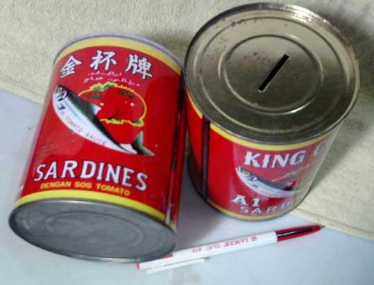 กระปุกออมสินสังกะสีเก่าลายปลากระป๋อง