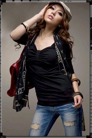 *พร้อมส่ง* เสื้อยืดสีดำ คอวี จีบที่อก (dressuphouse รหัส 219)