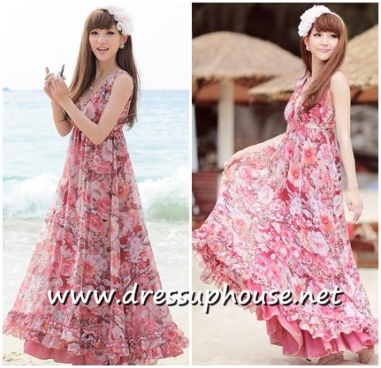 dressuphouse รหัส m754 maxy dress ชีฟองลายดอกชมพู คอวี แขนกุด สวยมาก