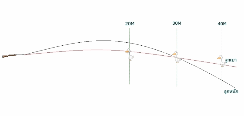 ในรูปหมายถึงว่า ยิงลูกเบา และลูกหนัก โดยตั้งกล้อง ไว้ที่ 30เมตร ทั้งคู่ ลูกจะวิ่งเหมือนในรูป