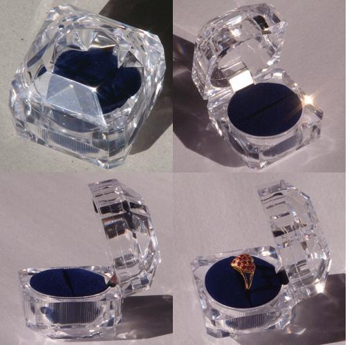 กล่องใส่แหวน เป็นกล่องแก้วใส ฐานใส่แหวนกำมะหยี่สีน้ำเงิน