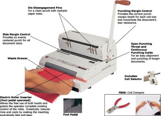 รายละเอียด: คุณลักษณะของเครื่องเจาะกระดาษและเข้าเล่มสันเกลียวไฟฟ้า COIL MAC ECI