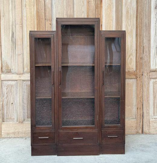 ตู้สามเกลอเซี่ยงไฮ้ งานเก่าไม้สักทั้งใบ ข้างโปร่งด้านบนมีชั้นวาง 3 ชั้น ด้านล่างมีลิ้นชัก 3 ลิ้นชัก งานดีสีเดิม กว้าง 113.5 สูง 165 ลึก 32(33.5) cm ราคา 15,000 บาท
