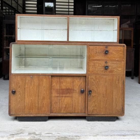 ตู้ไซด์บอร์ด งานเก่าทรงหนาไม้สักทั้งหลัง ด้านบนเป็นช่องกระจกสำหรับโชว์ของ ด้านขวาเป็นลิ้นชักสองลิ้นชักและช่องเปิดเก็บของ ด้านล่างสุดเป็นบานเลื่อนเก็บของอีกชั้น โครงสร้างแน่น ใช้งานได้จริง เหมาะสำหรับวางในบ้าน ร้านอาหาร หรือร้านกาแฟสไตล์วินเทจ