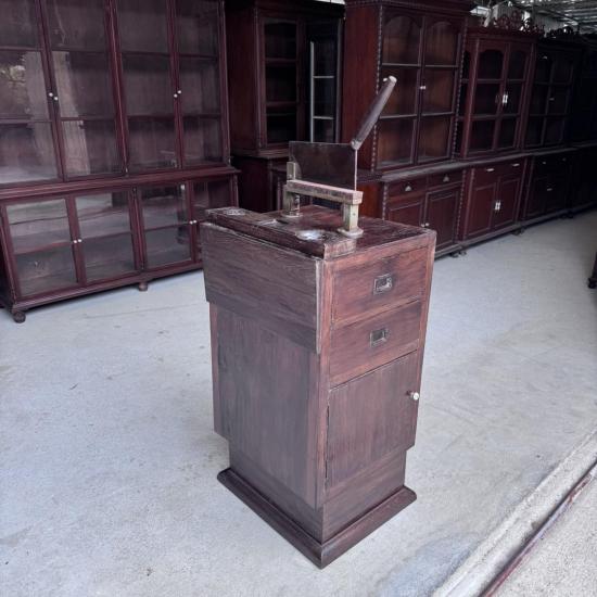 เคาน์เตอร์หั่นยาโบราณฟอร์มใหญ่สำหรับการยืนใช้งาน หายากมากไม่ค่อยพบเจอ ตัวเคาน์เตอร์ทำจากไม้สัก อายุเกิน 60 ปี ด้านข้างมีช่องสำหรับเสียบมีด ด้านบนทำท็อปพร้อมช่องวางของหรืออุปกรณ์ 3 ช่อง เหมาะสำหรับจัดวางโหลยาโบราณหรือของสะสม ด้านหลังประกอบด้วยลิ้นชัก 2 ช่องและบานเปิด 1 ช่อง ขาเป็นทรงแชมเปญ แข็งแรงและได้อารมณ์งานร้านยาเก่าแบบดั้งเดิม