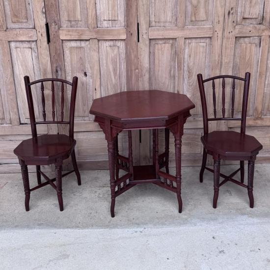 โต๊ะจิบน้ำชาไม้มะค่าท็อปแปดเหลี่ยมงานเก่าอายุเกิน 40 ปี ตัวโต๊ะทำจากไม้แผ่นเดียวท็อปเป็นทรงแปดเหลี่ยม ขาโต๊ะเป็นเกลียวเชือกแข็งแรง สวยงาม มีจิกลายดอกไม้รอบตัว เสริมบรรยากาศคลาสสิกให้กับห้องหรือมุมพักผ่อน เก้าอี้พื้นนั่งเป็นไม้แผ่นเดียวเช่นกัน ให้ความรู้สึกมั่นคงและกลมกลืนกับชุดโต๊ะ ทั้งชุดสภาพดีพร้อมใช้งาน เหมาะสำหรับใช้เป็นมุมจิบน้ำชา หรือจัดวางในบ้าน ร้านอาหาร หรือร้านกาแฟแนววินเทจ