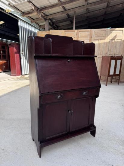 ตู้หรือโต๊ะทำงานสไตล์ยุโรปไม้สักแท้งานเก่าหายาก สีเดิมทั้งใบ พื้นโต๊ะพับเปิดได้เป็นพื้นที่ทำงาน ด้านในจัดแบ่งช่องเก็บแฟ้มและหนังสืออย่างเป็นระเบียบ มีช่องเล็กหลายช่องสำหรับใส่ของใช้หรือเอกสาร พื้นโต๊ะทำงานสูงกำลังดี ออกแบบอย่างลงตัวตามแบบยุโรปยุคเก่า มือจับลายอาร์ตนูโวเข้ากับตัวตู้ทุกจุด อุปกรณ์เดิมเป็นทองเหลืองทั้งหมด โครงสร้างไม้สักแท้เข้าหางเหยี่ยวแบบโบราณ บานเปิดคู่ด้านล่างเป็นไม้แผ่นเดียว ด้านหลังใช้ไม้หน้าใหญ่สามแผ่น สะท้อนฝีมือช่างยุคเก่า เหมาะสำหรับตก แต่งห้องทำงานหรือมุมอ่านหนังสือ