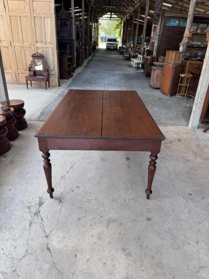 โต๊ะขากลึงตัวใหญ่งานไม้เก่าทั้งใบ ท็อปหน้าไม้สองแผ่น หน้าไม้กว้าง 22-22.5 นิ้ว โครงสร้างแข็งแรง ขากลึงทรงใหญ่ให้ความคลาสสิก เหมาะใช้งานได้หลากหลาย ทั้งเป็นโต๊ะทำงาน โต๊ะประชุม หรือโต๊ะทานอาหาร หน้าโต๊ะมีตำหนิเล็กน้อยตามภาพ โดยรวมสภาพดี พร้อมใช้งาน
