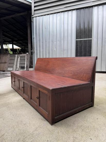 โซฟาไม้สัก งานพิเศษชิ้นนี้สามารถใช้นั่งหรือนอนได้ ด้านล่างมีช่องเก็บของ 6 บานเปิด ขอบบานเดินลายไข่ปลารอบตัว พนักพิงโค้งรับหลังสวยงามตามแบบงานโบราณ เป็นไม้สักทั้งหลัง อายุมากกว่า 50 ปี พื้นนั่งและพนักพิงทำจากไม้แผ่นใหญ่ทั้งชิ้น แข็งแรง ใช้งานได้จริง เหมาะสำหรับตั้งในบ้านหรือมุมพักผ่อน