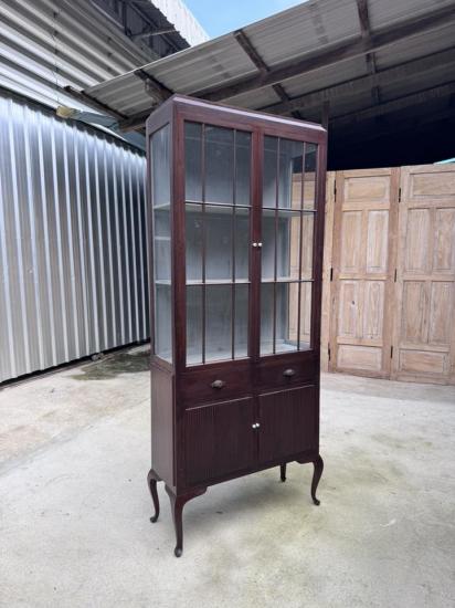 ตัวตู้ด้านบนเป็นบานกระจกกรอบไม้คิ้วหต้าแบ่งช่องสี่เหลี่ยม เหมาะสำหรับจัดวางของสะสมหรือของโชว์ มีสองลิ้นชักอยู่ตรงกลาง เพิ่มฟังก์ชันการใช้งานสะดวก ด้านล่างเป็นบานเปิดลูกฟูก ให้บรรยากาศคลาสสิก กลมกลืนกับขาจิ้งจกหัวคว่ำที่เป็นเอกลักษณ์ แข็งแรงและสง่างามในตัว เหมาะสำหรับวางในห้องรับแขกหรือมุมสะสม