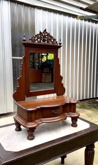 คันฉ่องโบราณสไตล์ยุโรปงานไทยเก่า สไตล์ยุโรป บัวโค้งสวยงาม ตัวกระจกเดิมทรงสูงโปร่ง เหมาะสำหรับตั้งบนโต๊ะเครื่องแป้งหรือนั่งใช้งานบนพื้น เข้ากับบ้านสไตล์คลาสสิกและร้านวินเทจได้ดี เป็นงานฝีมือเก่าที่มีเอกลักษณ์เฉพาะตัว เป็นไม้สักทั้งตัวลิ้นชักเข้าหางเหยี่ยวแบบโบราณ สีเดิมสวยพร้อมใช้งาน