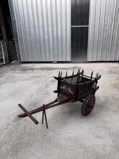 เกวียนโชว์ลวดลายประดับกระจกงานศิลปะล้านนาเก่าที่มีเอกลักษณ์เฉพาะตัว โครงสร้างทำจากไม้เนื้อแข็งผสมไม้สัก ด้านหน้าเกวียนประดับกระจกเป็นลายช้างคู่ สะท้อนถึงความหมายมงคลในงานบุญและพิธีสำคัญของชาวเหนือในอดีต ลวดลายมีร่องรอยหลุดลอกตามกาลเวลา แต่ยังคงความงดงามเดิม เหมาะสำหรับตก แต่งบ้าน ร้าน หรือใช้จัดแสดงเป็นของสะสมทางวัฒนธรรม