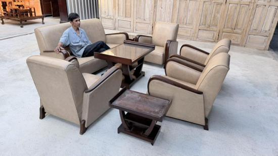ชุดรับแขกไม้สักหุ้มเบาะงานเก่าชุดรับแขกไม้สักครบชุด ประกอบด้วยโซฟาเดี่ยว 4 ตัว โซฟาตัวยาว 1 ตัว โต๊ะกลาง และโต๊ะวางของข้าง 2 ตัว ทั้งหมดเป็นงานไม้สักเก่าอายุ 50-60 ปี โครงสร้างแข็งแรง ทรงอ้วนแน่นแบบยุคเก่า เบาะหุ้มให้ผิวสัมผัสนุ่มนั่งสบาย เบาะมีตำหนิบ้างเล็กน้อย แต่ยังใช้งานได้ดี โต๊ะกลางและโต๊ะข้างเป็นงานไม้สักเข้ารูป ตัดกระจกวางด้านบน เพิ่มความเรียบร้อยและใช้วางของได้สะดวก เหมาะสำหรับจัดวางในมุมรับแขกหรือห้องทำงานสไตล์วินเทจ