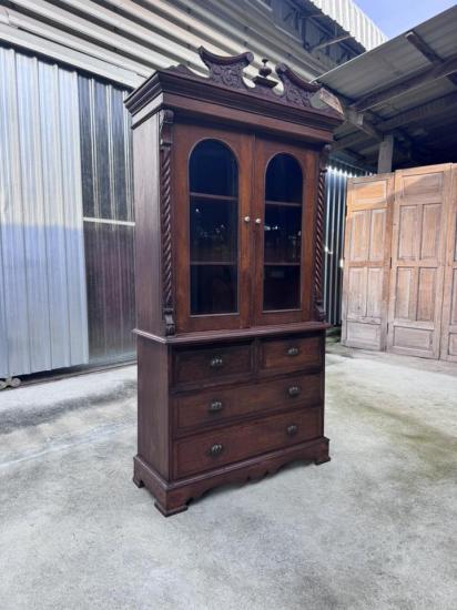 ตู้หัวบัวข้างเกลียวเชือกกระจังยุโรปสามถอดงานเก่าไม้สักทั้งหลัง อายุเกิน 70 ปี ตัวหัวบัวแกะลายข้างเกลียวเชือกงามแบบยุโรป ด้านบนเป็นบานเปิดคู่ ภายในมีชั้นวางสามชั้น ถัดลงมาเป็นส่วนลิ้นชักสี่ลิ้นชัก แบ่งเป็นลิ้นชักเล็กสองช่องและลิ้นชักใหญ่สองช่อง มือจับเดิมครบ สีเดิมทั้งหลัง โครงสร้างแข็งแรง สามารถถอดแยกได้สามส่วน ได้แก่ กระจังด้านบน ตัวตู้โชว์กลาง และช่วงล่างที่เป็นลิ้นชัก เหมาะสำหรับตก แต่งบ้านหรือโชว์ของสะสม