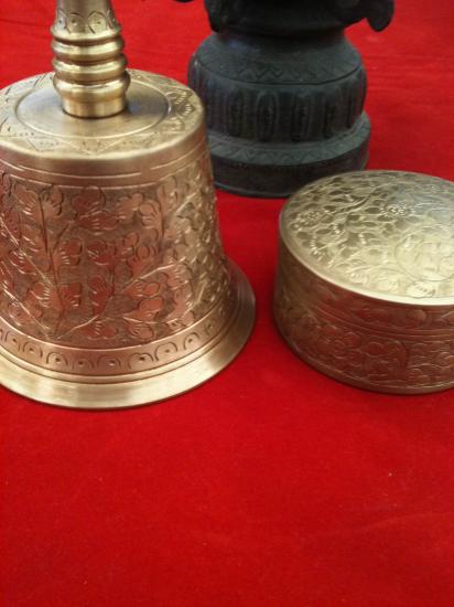 กระดิ่งทองเหลืองตอกลาย ด้ามจับทองเหลือง