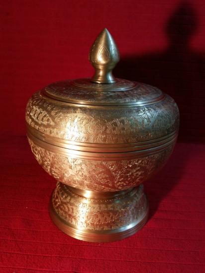 โถน้ำมนต์ทองเหลืองตอกลายพิกุล ฝาจุกใหญ่ ขันน้ำมนต์ 8 นิ้ว