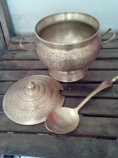 หม้อเสิร์ฟข้าวทองเหลืองตอกลาย พร้อมทัพพีตอกลาย