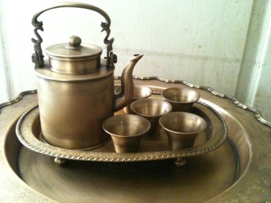 ชุดน้ำชากาหล่อโบราณ ถาดยาว 11 นิ้ว ถาดทองเหลือง