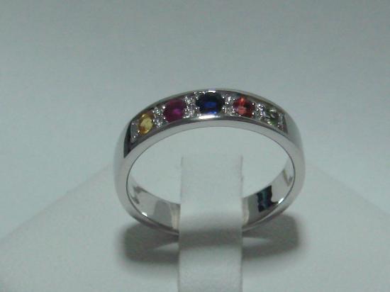 ประกอบด้วยพลอยแฟนซี5สี ได้แก่ บุษราคัม ทับทิม ไพลิน แซฟไฟร์ส้ม เขียวส่อง ชนิดละ 1 เม็ด ตัวเรือนเงินชุบทองคำขาว ขนาดแหวน 49