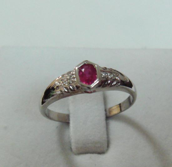 ประกอบด้วยพลอยทับทัมเจียรนัยเม็ดเล็ก 1 เม็ด และเพชรสวิสประดับด้านข้าง ข้างละ 2 เม็ด ตัวเรือนเงินชุบทองคำขาว ขนาดแหวน52.5